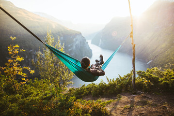 Man resting in hammock above fjord in Norway at sunset