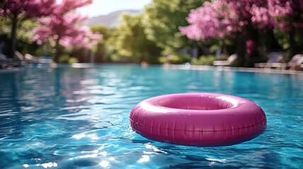 An inflatable ring floats on a tranquil turquoise pool, enhancing a relaxing summer holiday scene of carefree fun under the bright sun.