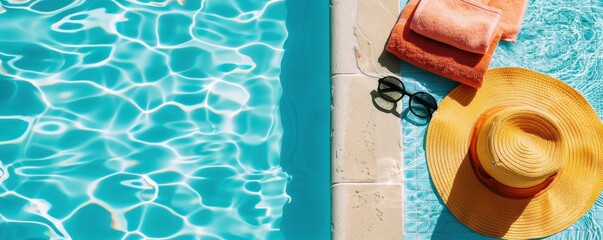 Summer vacation essentials by the pool with a hat, towel, and sunglasses. Perfect for a relaxing day under the sun.