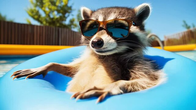 Playful raccoon rocking sunglasses, relaxing on vibrant pool float under bright summer sunshine