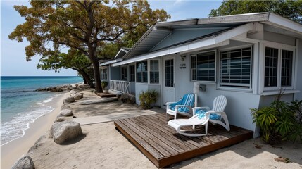 Cozy beach cabana with flowing white linen curtains offering a serene view of swaying palm trees and clear blue skies at sunset