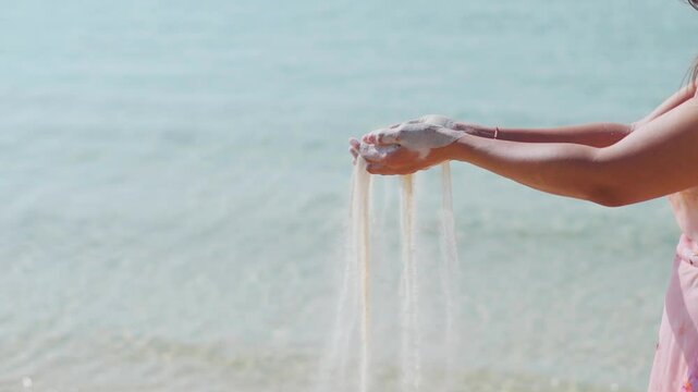Hands holding sand on background of beach, carefree moment. Stylish young woman in sweater releasing sand on coast. Sand running through hands. Time concept. Summer beach and vacation