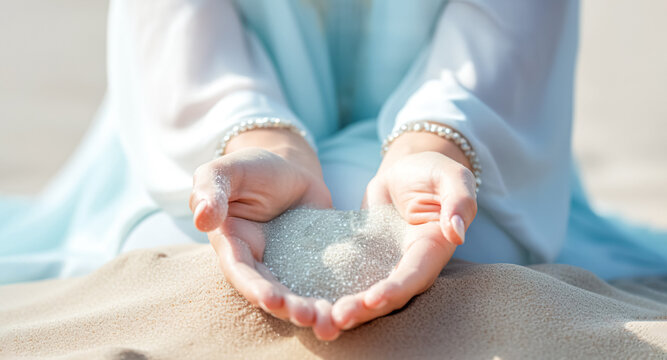 Close-up shot of two hands releasing sand in the air with warm, golden lighting and a shallow depth of field.