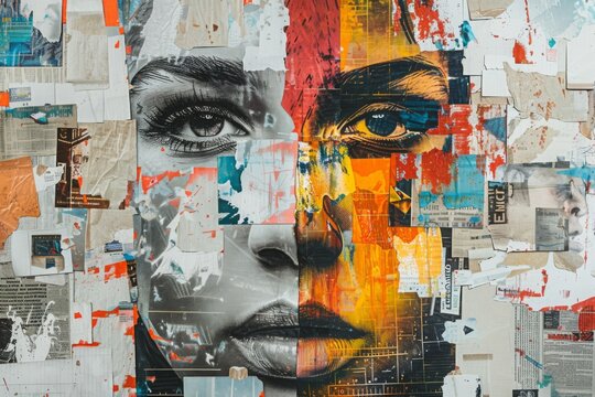 Close-up portrait of a womans face with colorful abstract overlays and collage elements