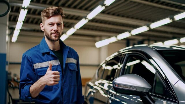 Mechanic in blue uniform offers thumbs up gesture in automotive workshop showing confidence reliability trust quality service