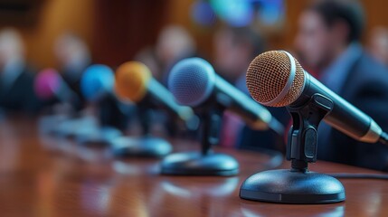 A row of colorful microphones is positioned on a table, suggesting a formal discussion or press conference setting.
