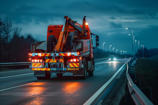 Nighttime Highway Rescue: Orange Tow Truck in Action