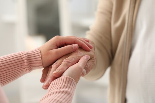 Trust and support. Woman with her dad joining hands indoors, closeup