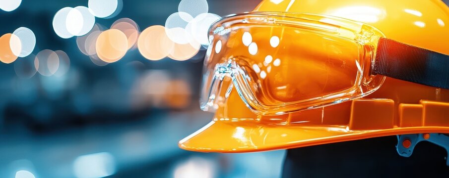 Safety helmet with goggles on a blurred background, ideal for construction scenes.