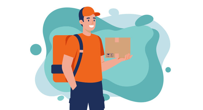 Smiling delivery courier in uniform holding a cardboard package outdoors, representing fast, reliable shipping and logistics services