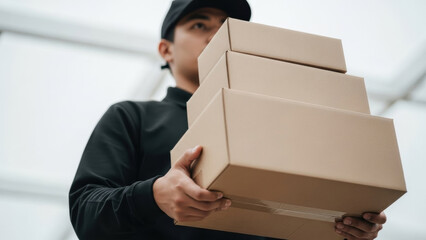 Young courier wearing a black uniform and cap holds a stack of brown cardboard packages. This low-angle shot highlights efficient and reliable delivery service.