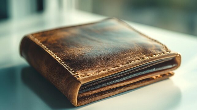 Close-up of a handcrafted brown leather wallet with visible stitching on a rustic wooden surface.
