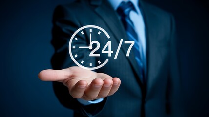 Service and Support Concept Showing 24/7 Clock Icon Floating Above a Professional Hand