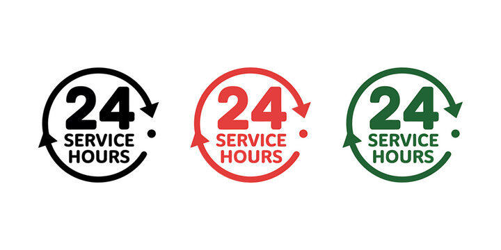 Set of 24 Service Hours icons in black, red, and green for round-the-clock customer support