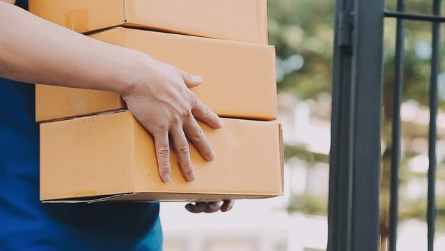 Excited Young Black African Couple receive cardboard boxes with products purchased online from delivery man, through local postal shipping and delivery parcel service.