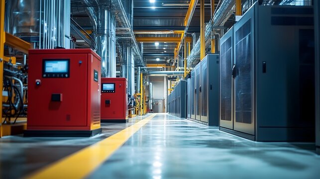 Low angle shot of electrical substation with metal towers against clear sky. Complex network cables, distribution equipment. Industrial facility ensures reliable energy supply. Power generation,