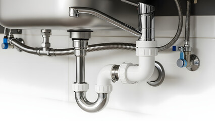 A detailed view of a sink's plumbing system with pipes and fittings Generative AI
