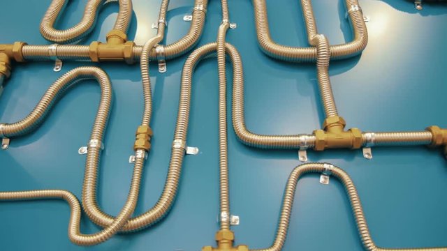 Corrugated flexible stainless steel pipes connected by tees and fittings on the blue stand. Very convenient and reliable solution for sanitary tasks. Shot in motion