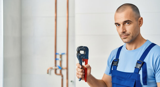 Plumber holding crimping tool in bathroom.  Professional plumber in blue overalls demonstrates crimping tool for pipes. Skilled worker uses crimping tool for reliable plumbing work.