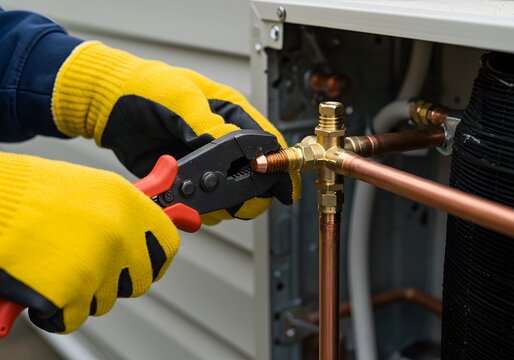 A plumber working on copper pipes, connecting them with brass fittings, ensuring a tight seal for reliable plumbing system, with his hands carefully tightening components.