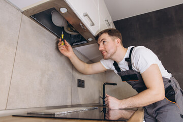 Plumber Repairing Extractor Hood in Modern Kitchen