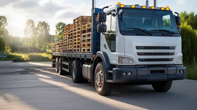 Efficient truck transporting wooden pallets on a sunny day, perfect for industrial logistics or supply chain videos, showcasing reliable delivery services