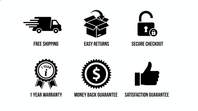 Icons representing free shipping, easy returns, secure checkout, warranty, money back, and satisfaction guarantees for online purchases