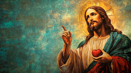 Painting of jesus christ with halo, holding heart and pointing upward against a textured background