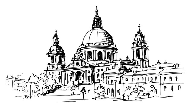 Hand drawn cathedral basilica with large dome and historical city architecture Vector sketch illustration of European religious landmark building