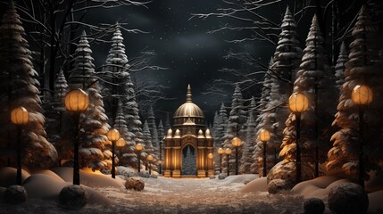 Illuminated christmas trees forest in on a snowy night close to christmas red garlands and golden decorations in an artificial stage at twilight