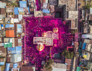 Aerial view of a vibrant Holi celebration engulfing the temple in a sea of pink powder amidst colorful rooftops, Jyotiba Dongar, Maharashtra, India.