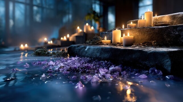 Peaceful scene of candles and purple crystals with soft lighting. Generative AI