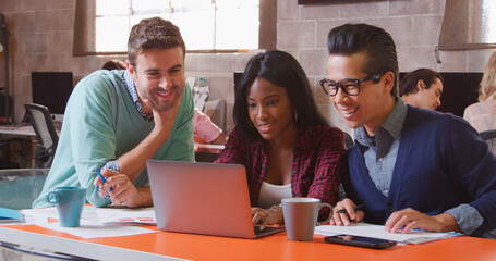 Three Designers In Creative Business Using Laptop Meeting In Modern Multi-Cultural Office