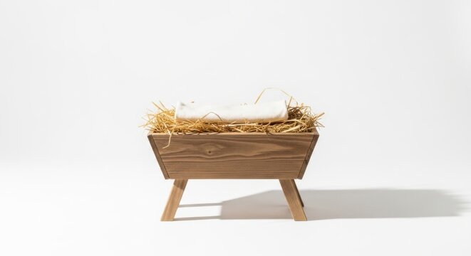Minimalist wooden manger with hay and a small white cloth on a clean white background