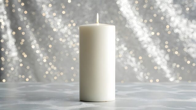 Elegant white candle burning softly against a shimmering silver backdrop
