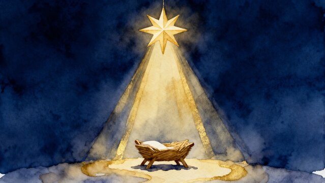 Minimalist watercolor of Bethlehem star shining over empty manger, dark blue background, soft golden light beams, symbolic, spiritual, simple composition, Christmas card design, elegant, peaceful.