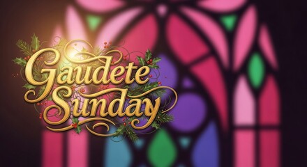 decorative backdrop for a religious observance featuring three pale-colored symbolic structures against a painted sky at dawn in shades of crimson  amber  and