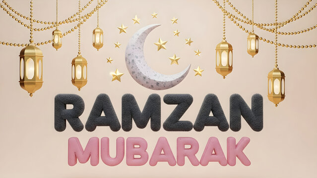 Festive 3d rendering of illuminated golden lanterns and a crescent moon celebrating the holy occasion of Ramzan Mubarak with textured typography