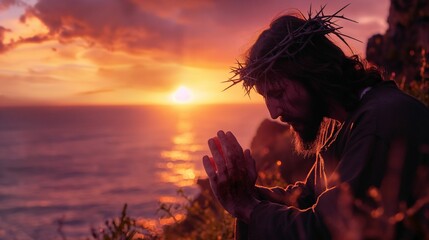Person wearing a crown of thorns sitting near a body of water at sunset.