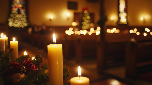 serene Christmas Eve church service illuminated by glowing candles creates warm and festive atmosphere. soft light reflects off decorations, enhancing seasonal spirit