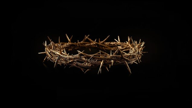 Crucifixion imagery featuring gold-toned cross and woven thorn crown on black backdrop, highlighting religious symbolism