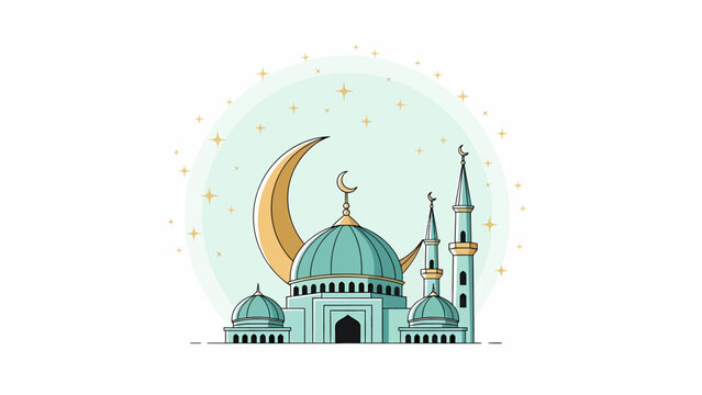 A stylized illustration of a mosque with a golden crescent moon and stars in the background, depicting Islamic architecture and religious symbolism.