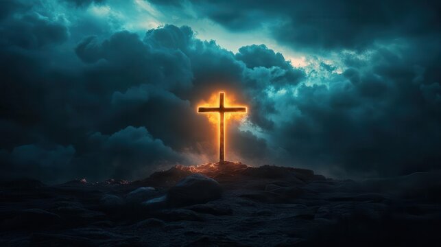 powerful religious scene depicting illuminated cross on golgotha hill dramatic storm clouds parting to reveal divine light symbolic representation of resurrection and hope
