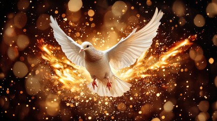 The image depicts a vibrant and dynamic scene showing a flying dove among flickering tongues of fire, symbolizing the divine presence and power of the Holy Spirit at the Pentecost event.