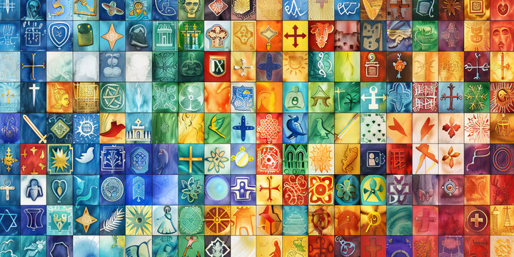The Global Mosaic: Religions as Colorful Tiles in a Cultural Mosaic - Visualize different religious symbols and practices as colorful tiles, coming together to form a diverse and vibrant mosaic