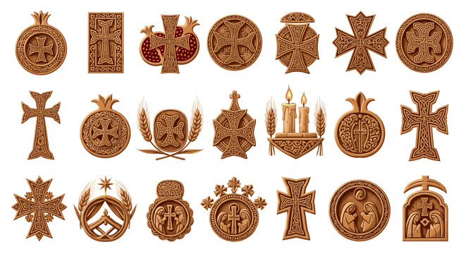 Collection of intricately carved wooden crosses and religious symbols in various shapes and designs