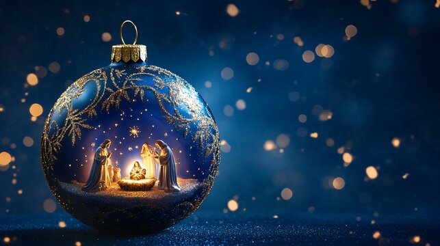 An ornate glass Christmas ball with a miniature nativity scene painted inside, softly glowing against a midnight blue background