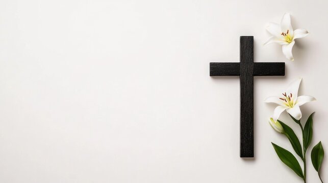 Christianity wooden cross with white lilies and silk ribbon on white background, religious holidays concept, Christian religion flat lay template