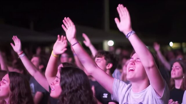 Attendees worshipping together with uplifted hands, Church Conference, banner Generative AI