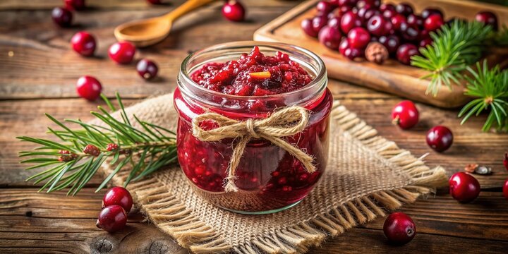 Freshly made cranberry relish filled to the brim in a rustic mason jar, adorned with a crimson ribbon, sits atop a burlap-covered wooden table.